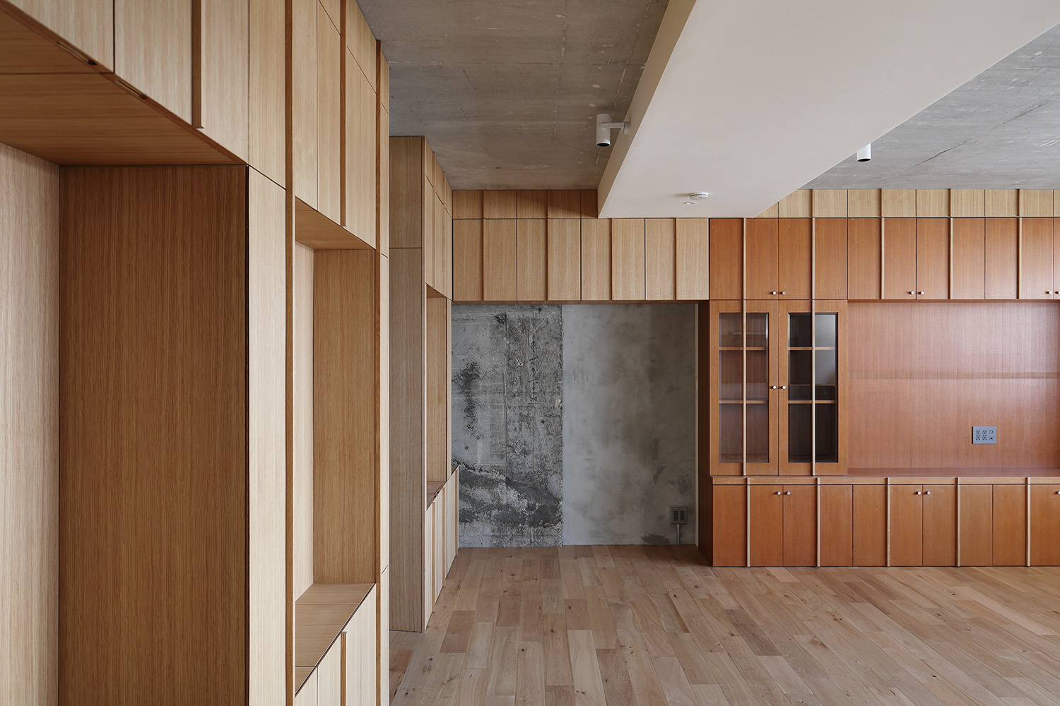 壁面のナラ突板材と既存コンクリート躯体の対比が、豊かな表情を生み出します。